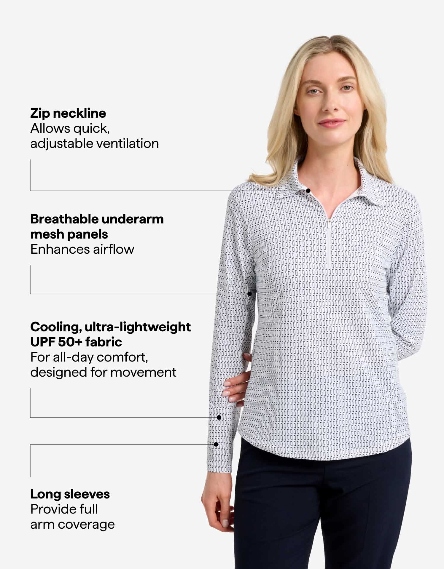 This women’s Long Sleeve Printed Zip Polo Shirt offers a relaxed fit, superior sun protection and breathable comfort for active days outdoors. Made from our Keep Your Cool UPF 50+ fabric, it provides lightweight coverage and promotes airflow to keep you cool.